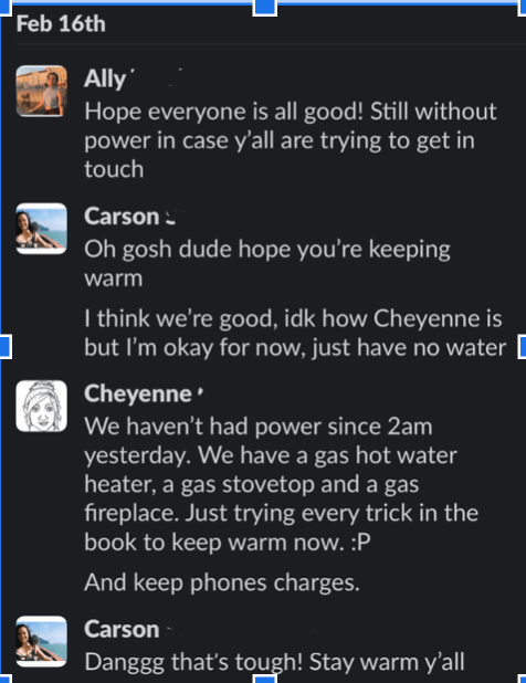 Once everyone was safe, warm, and had all their utilities, my team got together to see how we could get back on track with our project. While we didn’t reach our interview goal of 10 participants like we had originally planned, we were lucky enough to have interviewed 4 people before disaster struck.