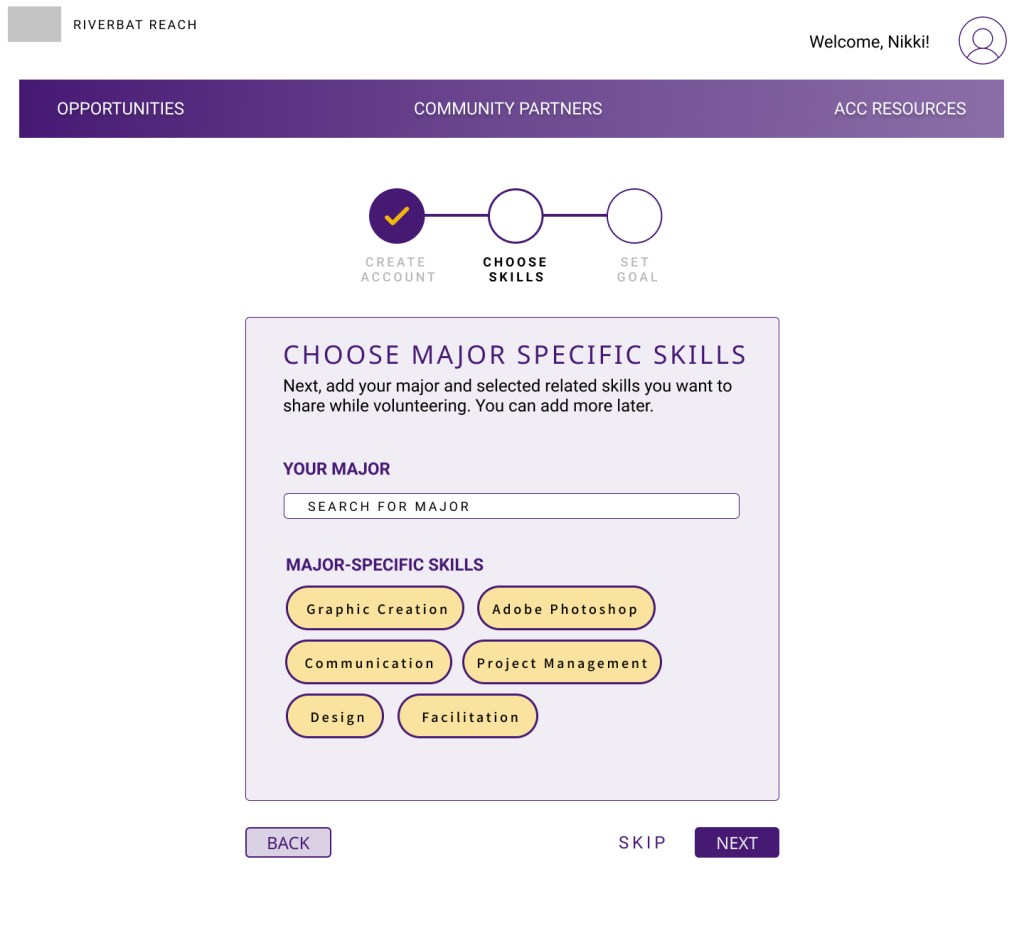 It provides users with a way to enter skills that they have or want to develop, to save events, connect with community organizations, and stay up to date with events that they have signed up for.