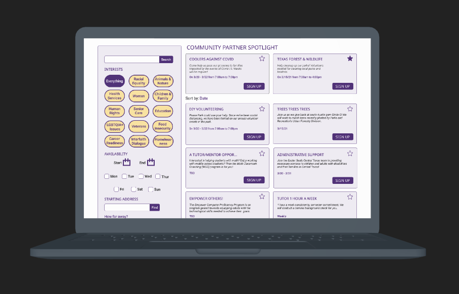 So the key take away here is that students are able to use the filter on the left and relevant volunteer opportunities would populate the right, simplifying the daunting task of finding the right opportunity.