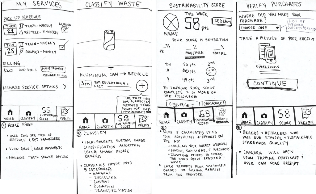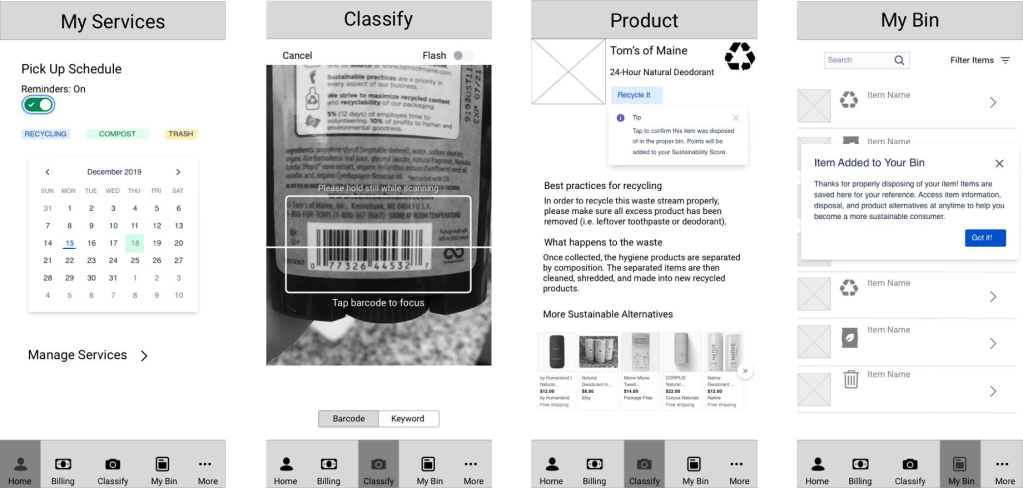 My initial wireframes explored how the users would stay informed on their waste pick up dates, identify the proper disposal method for an item using camera recognition and also earn a “sustainability score” to encourage their eco-conscious habits