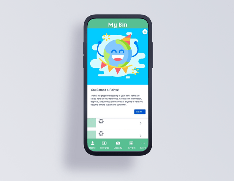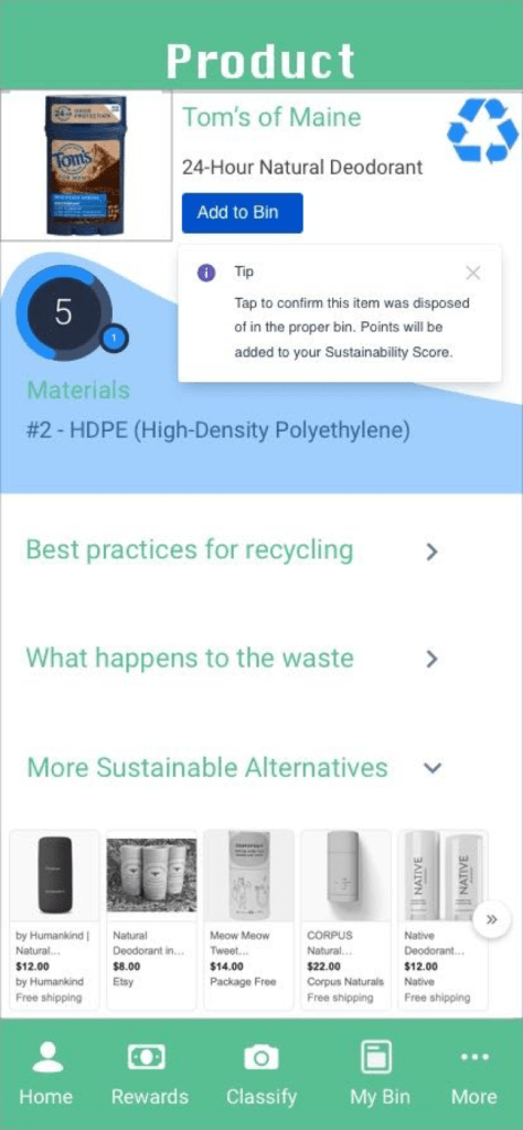 Eco Bins helps users build sustainable habits and incentivizes them through gamification, earning points for purchasing and properly disposing of their waste in compost or recycling bins, and earning real rewards for their eco-conscious behavior.