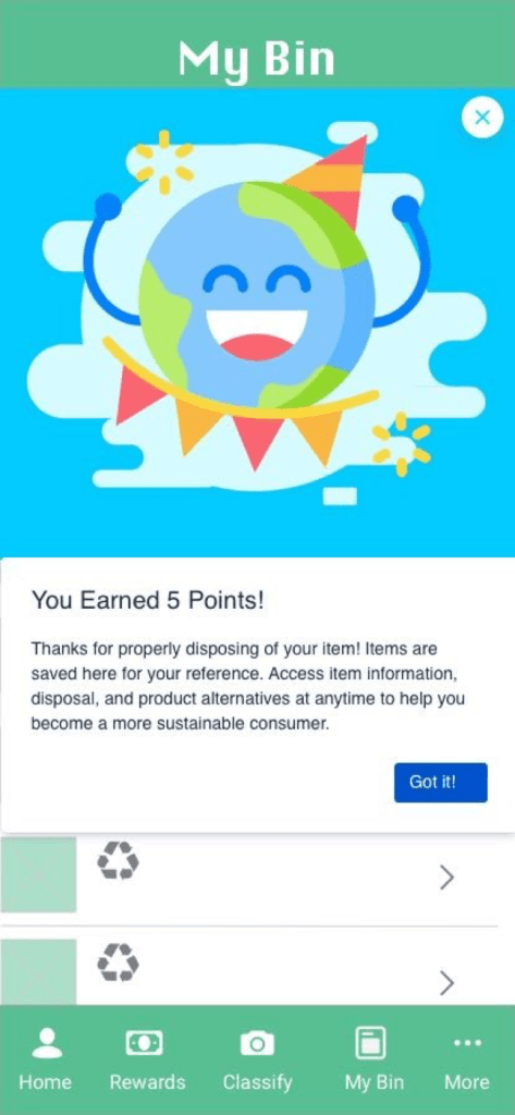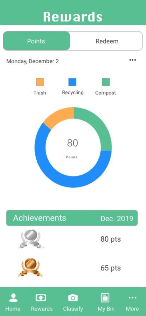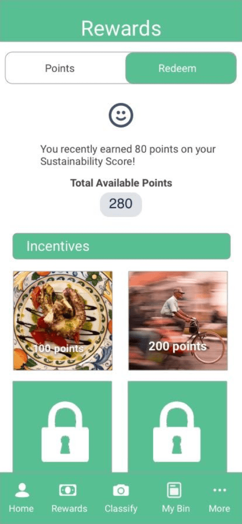 - Eco Bins offers tangible rewards such as products and services that the user can obtain by redeeming points and further cement their beneficial behaviors.
